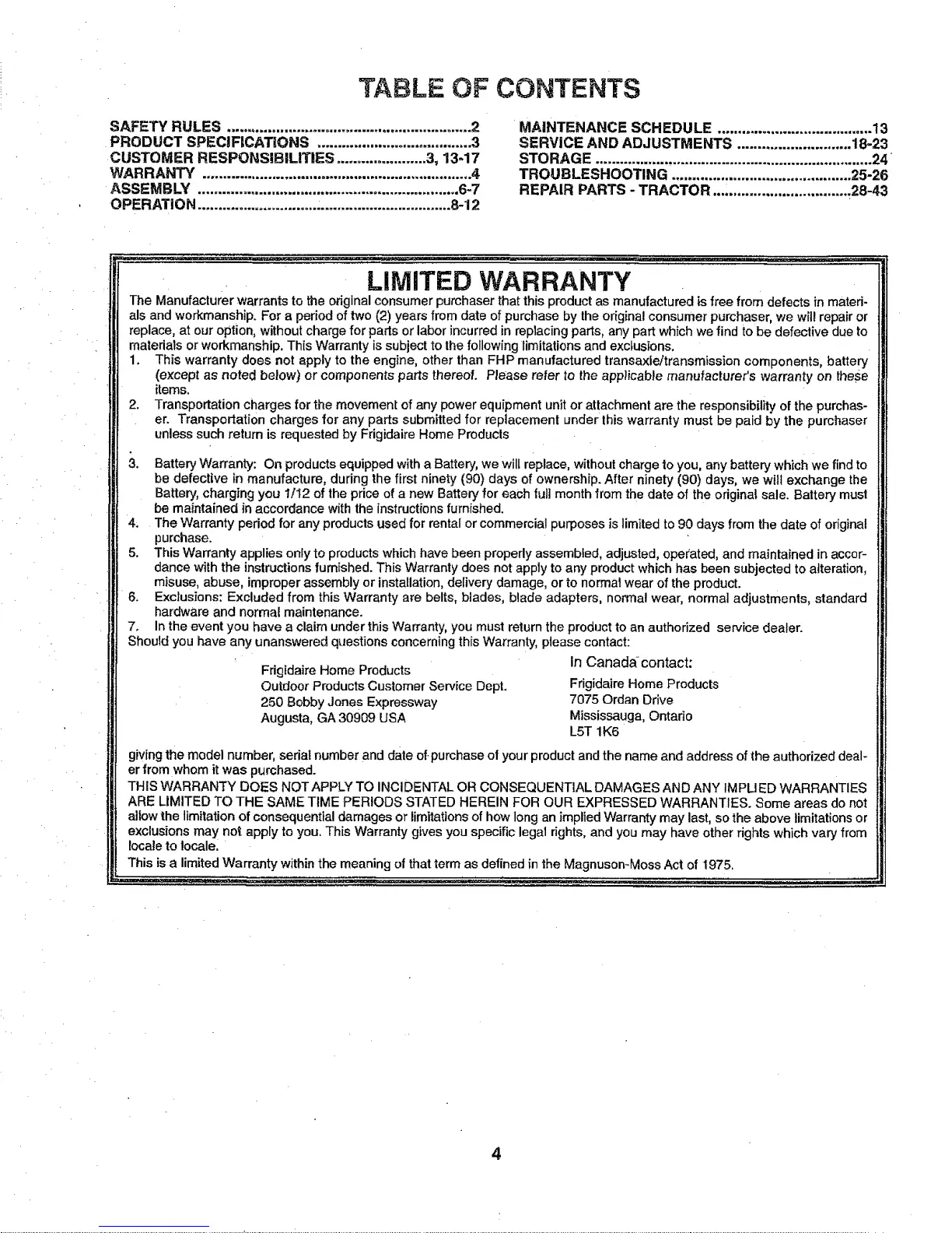 5. This Warranty applies only to products which have been properlyassembled, adjusted, opeCated,and maintained in accor-