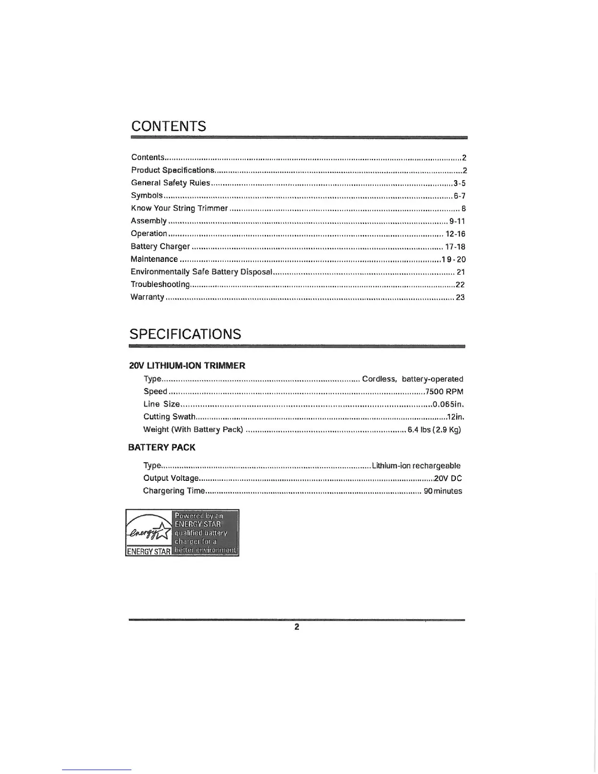 Weed Eater LT 20V - SPECIFICATIONS; 20 V LITHIUM-ION TRIMMER; BATTERY PACK