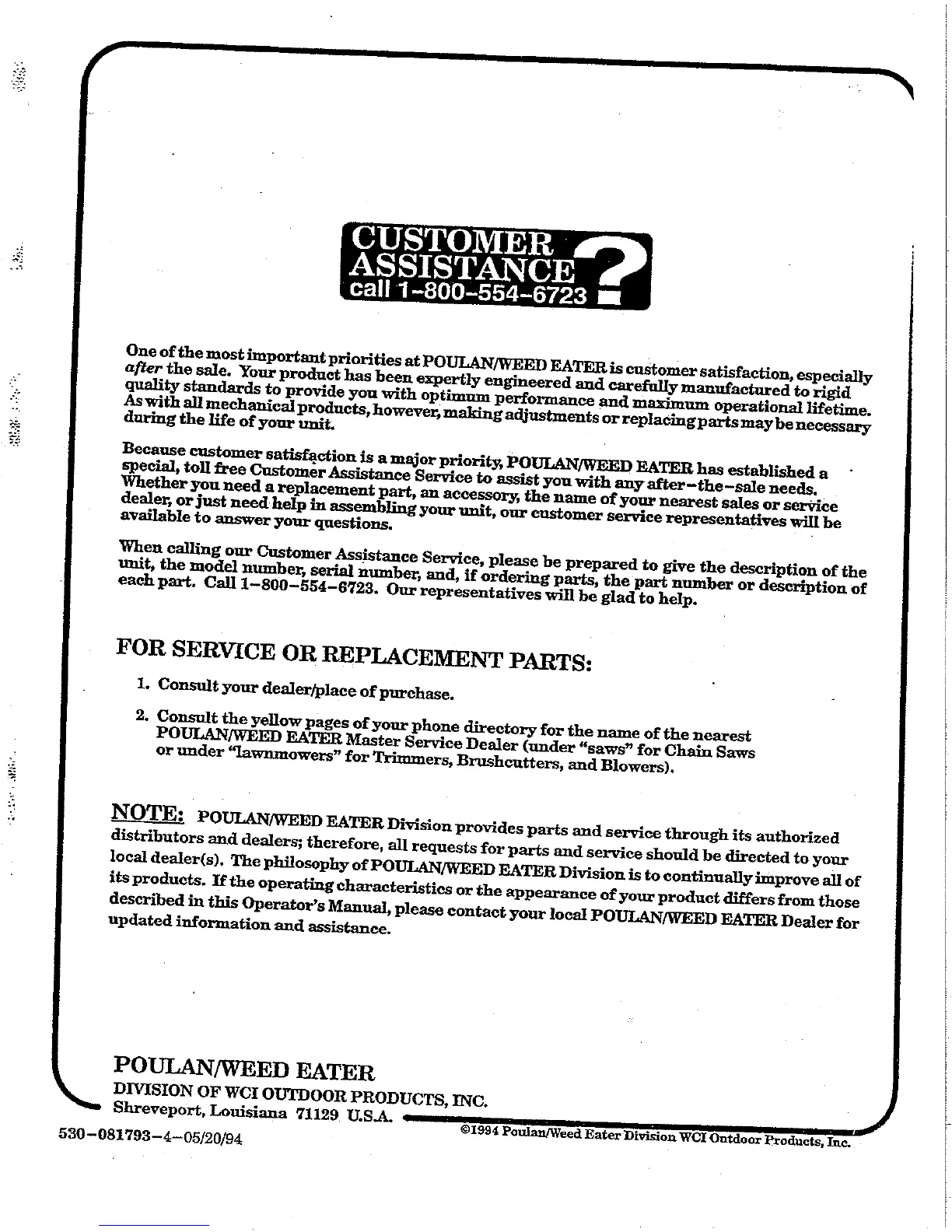 Weed Eater LT7000 - Customer Assistance and Service