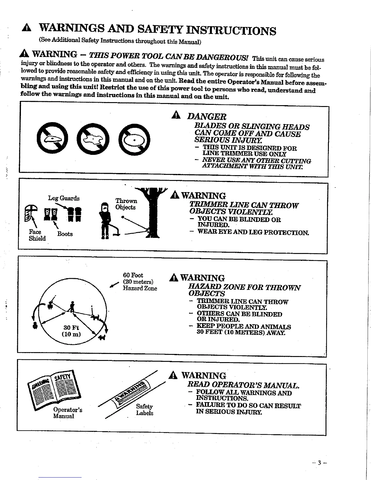 Weed Eater LT7000 - General Safety Warnings; Danger: Blades or Slinging Heads; Warning: Trimmer Line Throws Objects; Warning: Hazard Zone for Thrown Objects