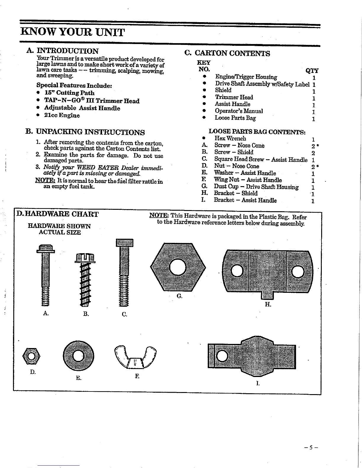 Weed Eater LT7000 - Know Your Unit; Introduction; Unpacking Instructions; Carton Contents