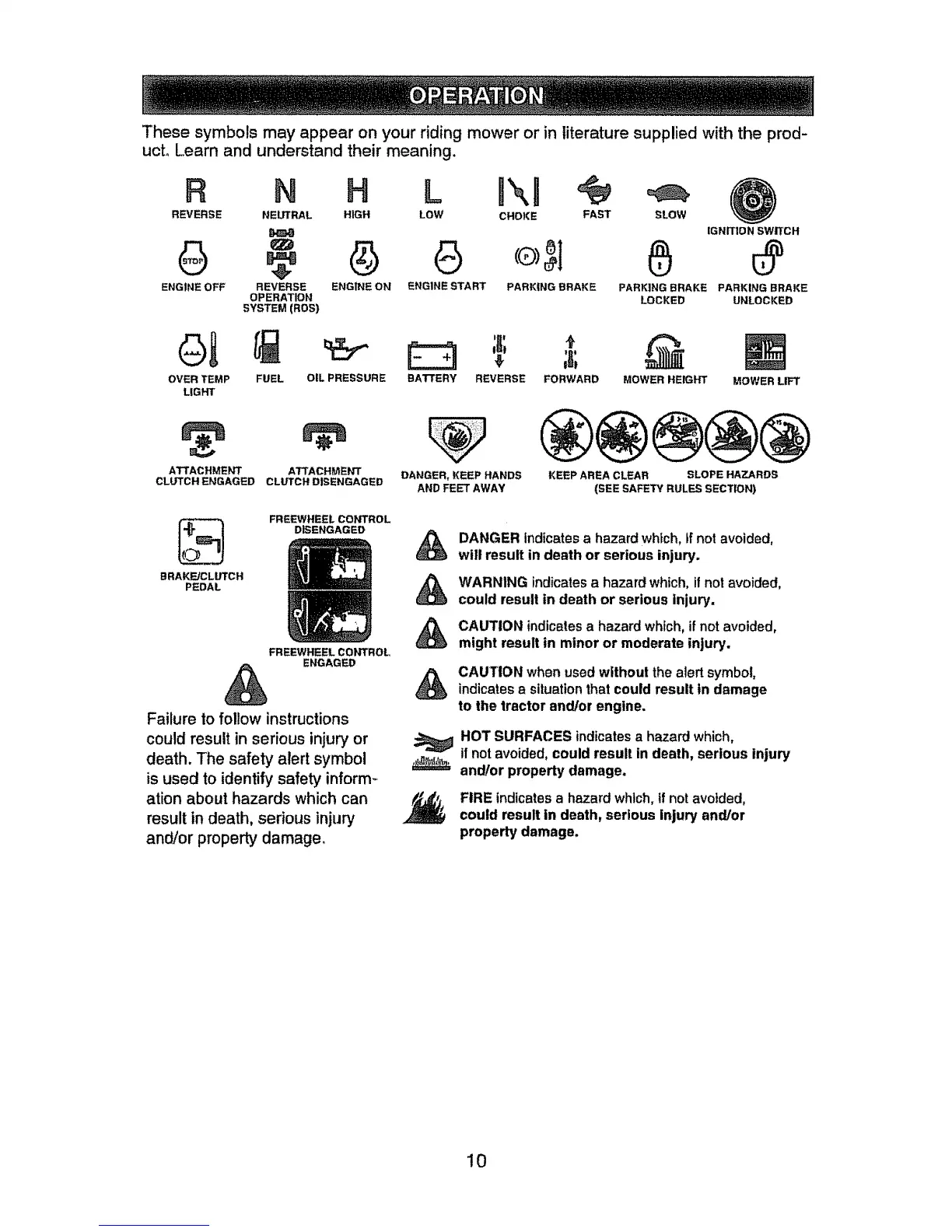 These symbols may appear on your riding mower or in literature supplied with the prod-