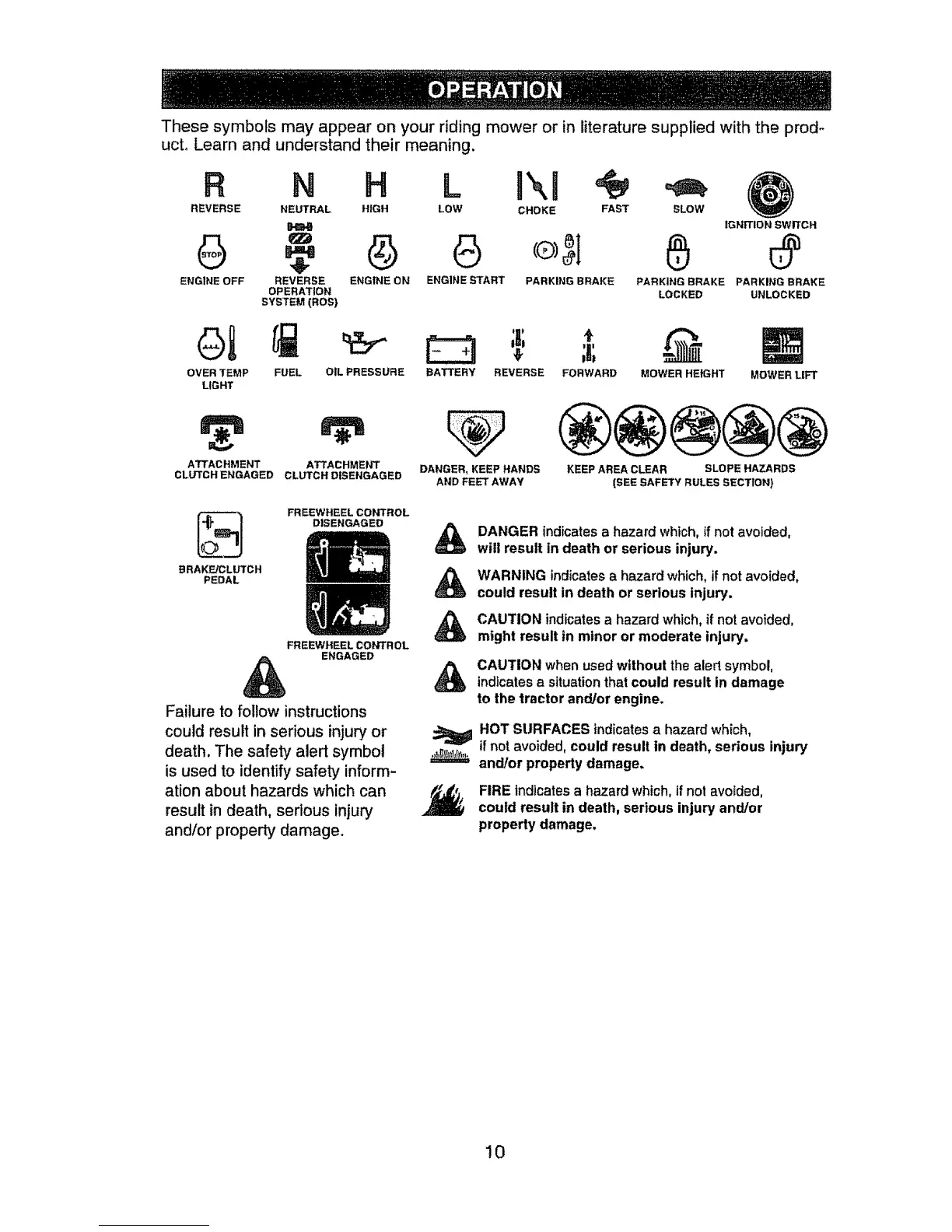 These symbols may appear on your riding mower or in literature supplied with the prod-