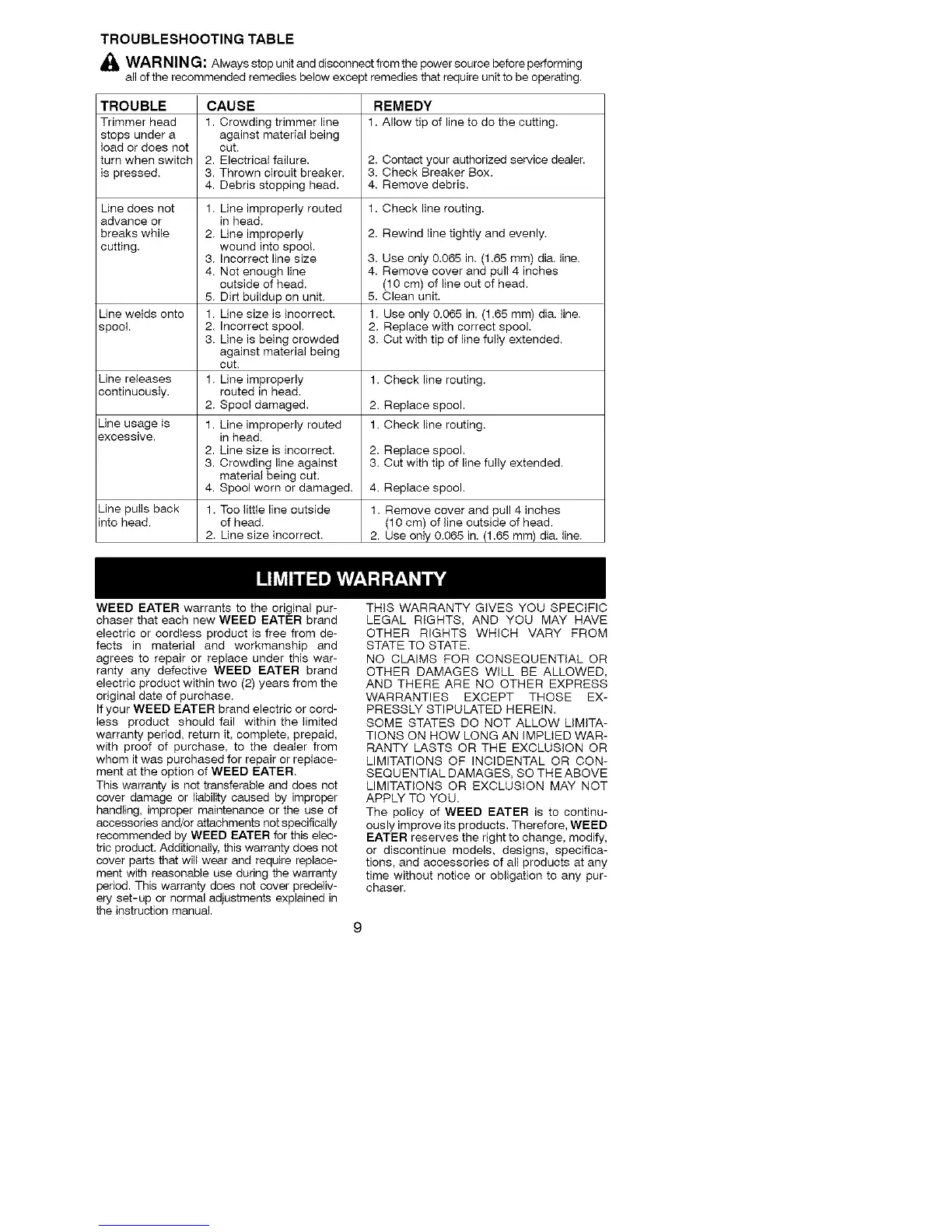 Line pulls back 1. Too little line outside 1. Remove cover and pull 4 inches