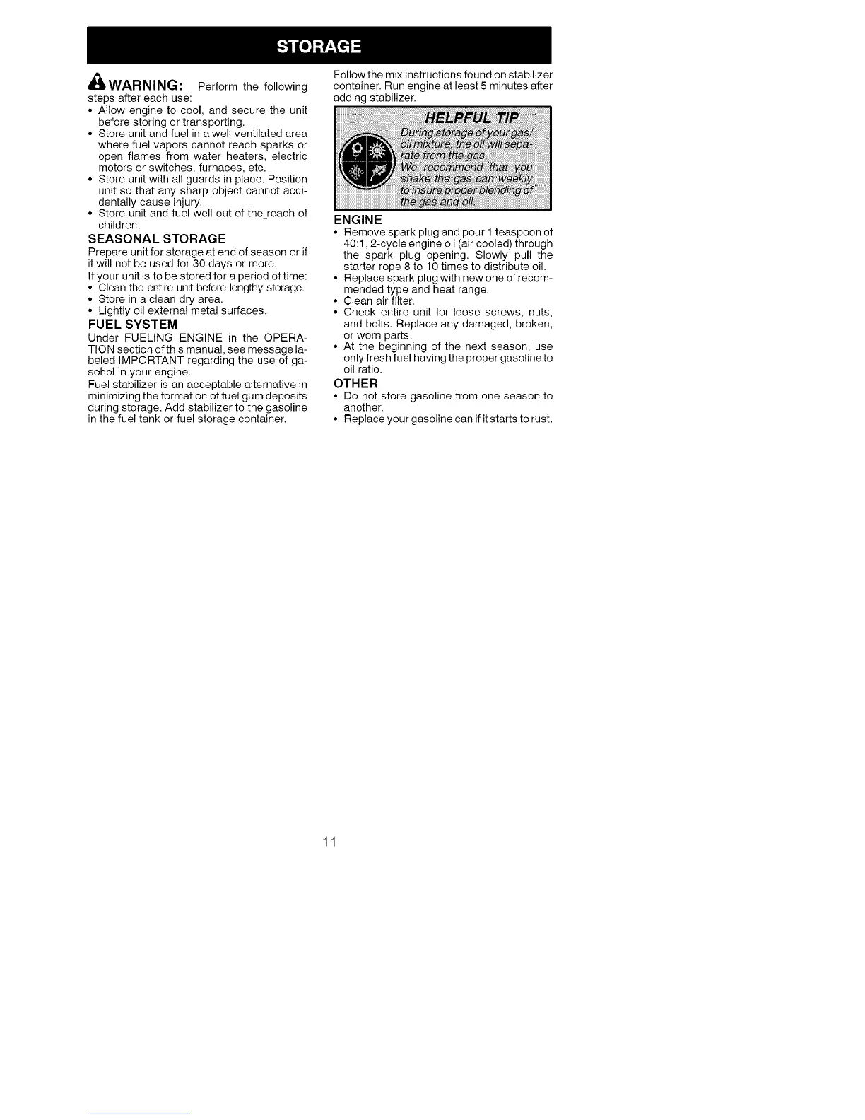 • Do not store gasoline from one season to