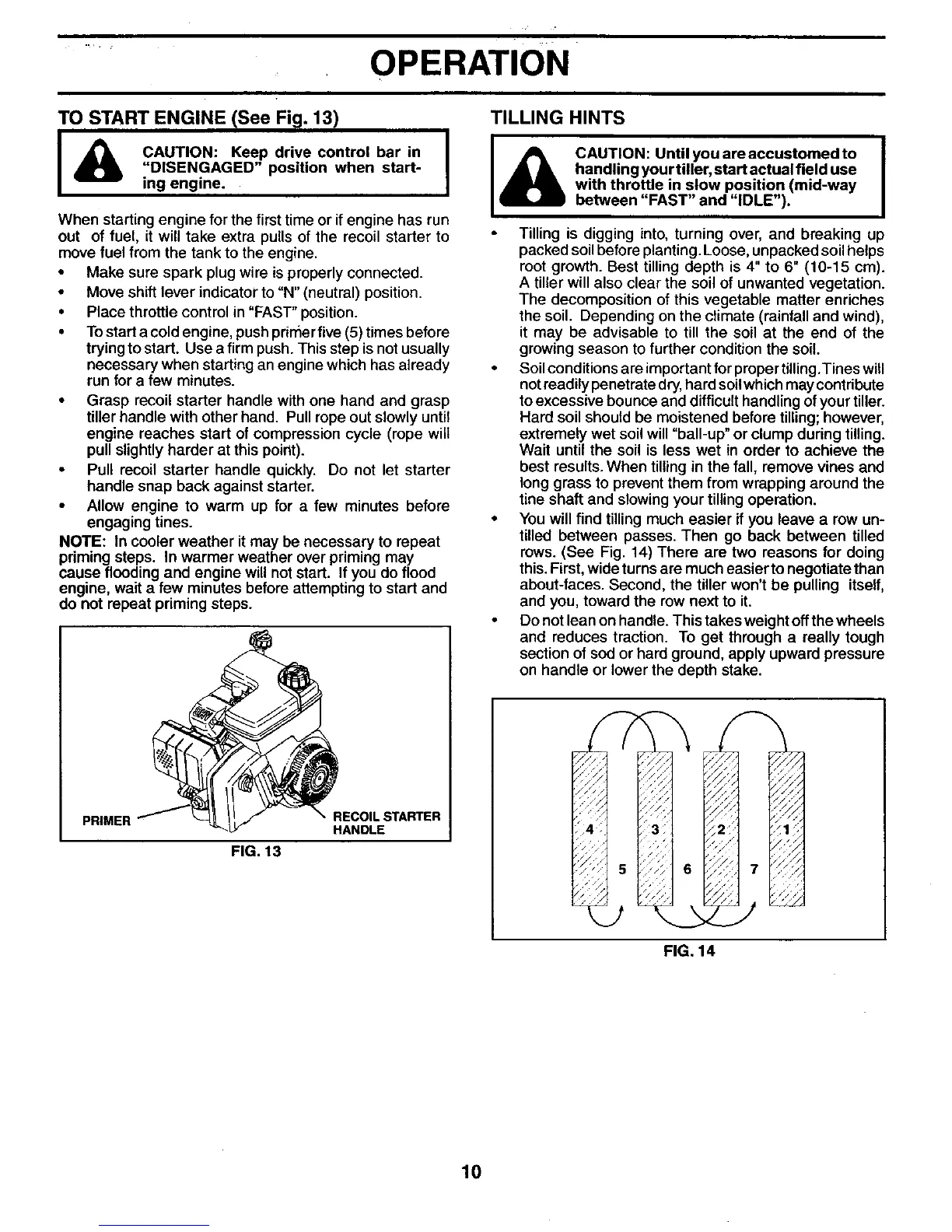 TO START ENGINE (See Fig. 13) TILLING HINTS