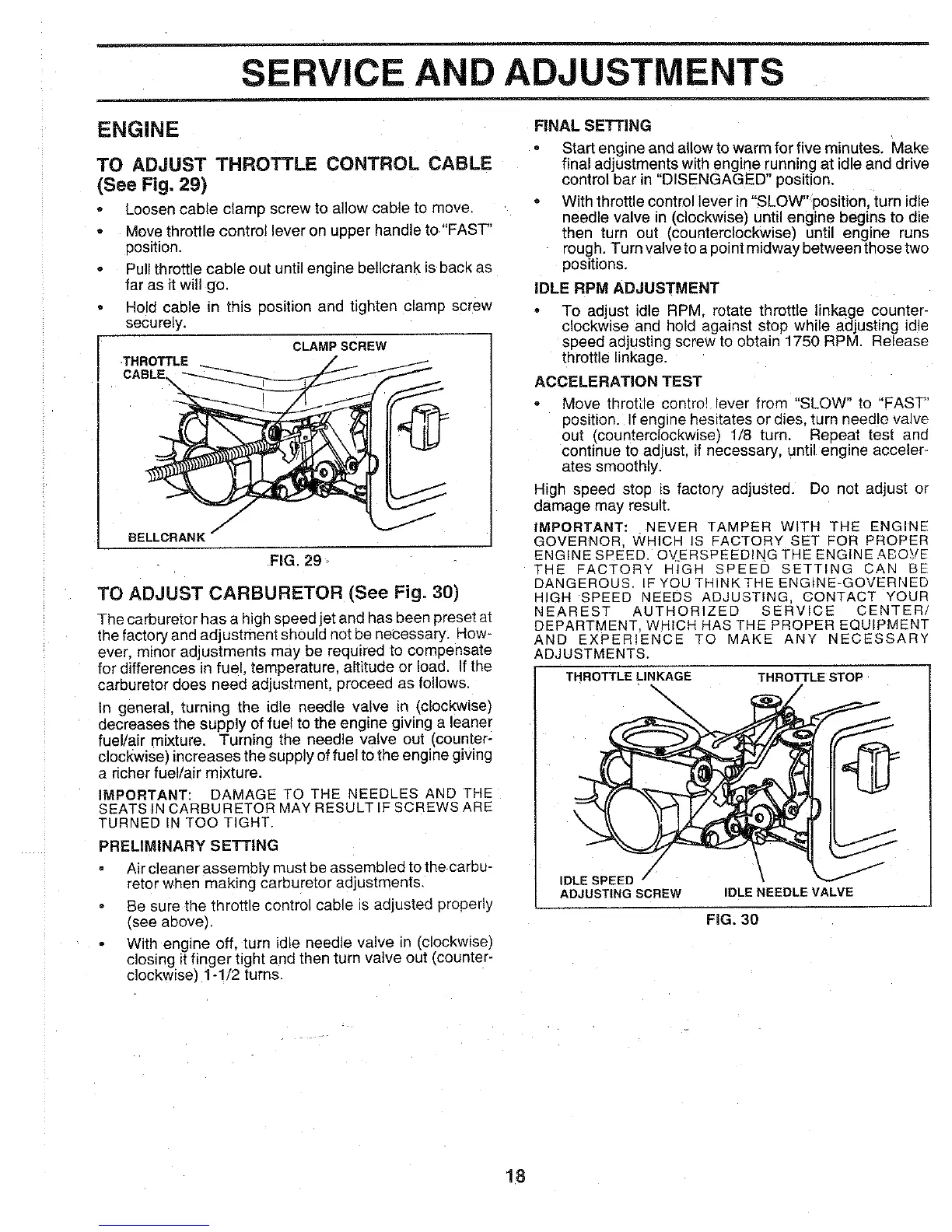 Weed Eater VIP HDR500D - To Adjust Throttle Control Cable; To Adjust Carburetor; Final Setting; Idle RPM Adjustment