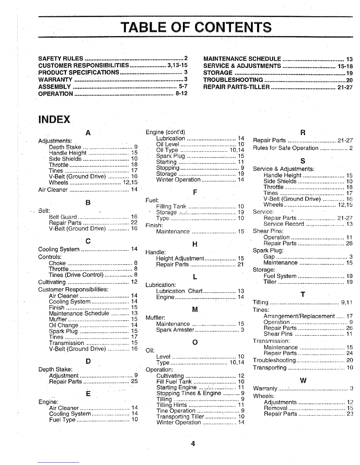 Weed Eater VIP HDR500D - Table of Contents; Index