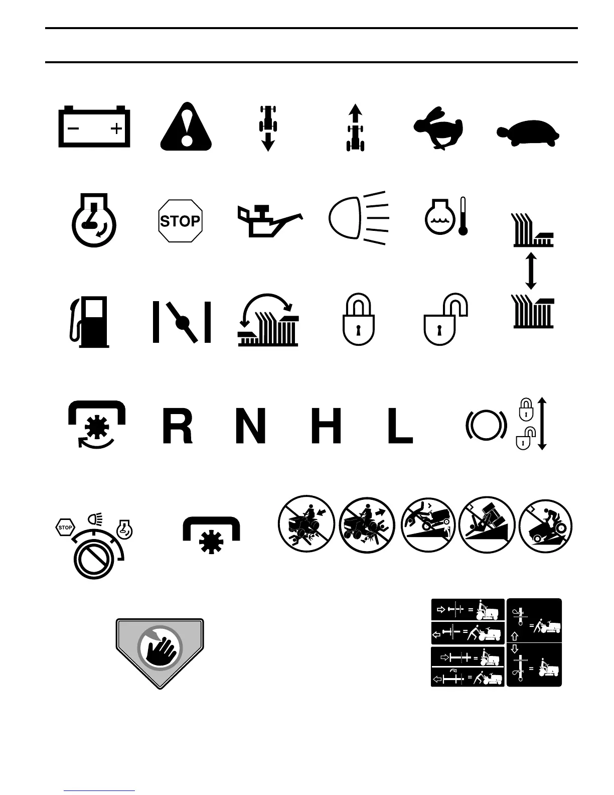 These symbols may appear on your tractor or in literature supplied with the product. Learn and understand their meaning.