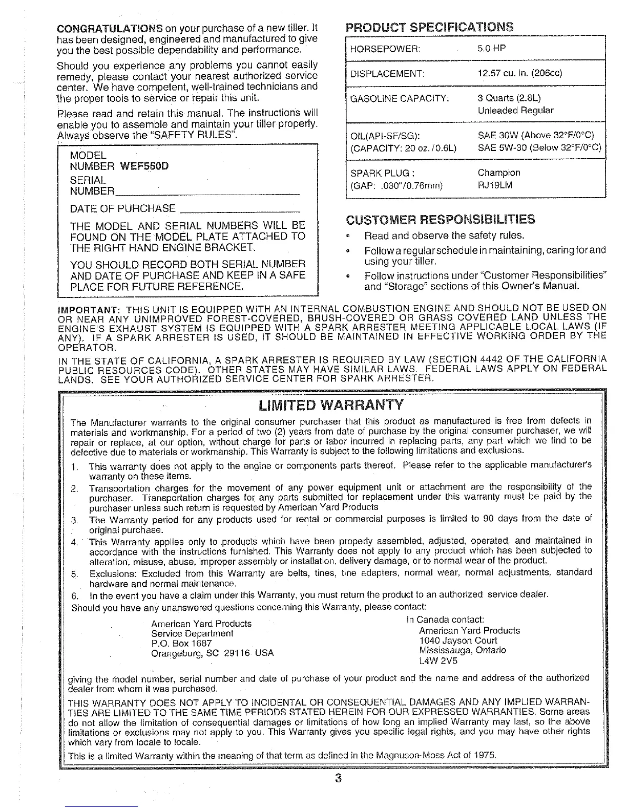 Weed Eater WEF550D - Product Specifications; Limited Warranty