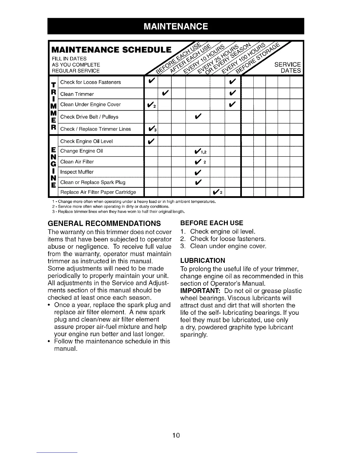 2 - Service more often when operating in dirty or dusty conditions.