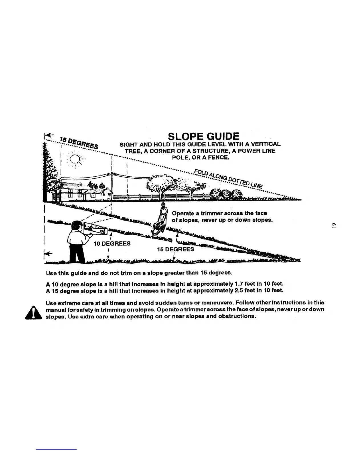 manual for safety in trimming on slopes. Operate a trimmer across the face of slopes, never up or down