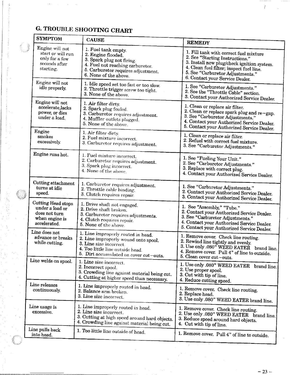 Weed Eater XT 85T - TROUBLE SHOOTING CHART