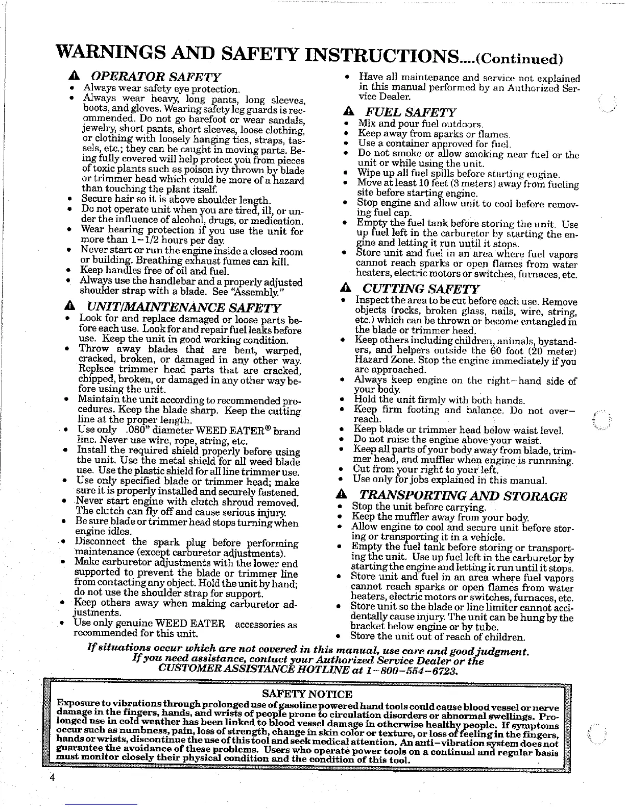 Weed Eater XT 85T - Operator and Unit Safety; Fuel and Cutting Safety; Transport and Storage Safety