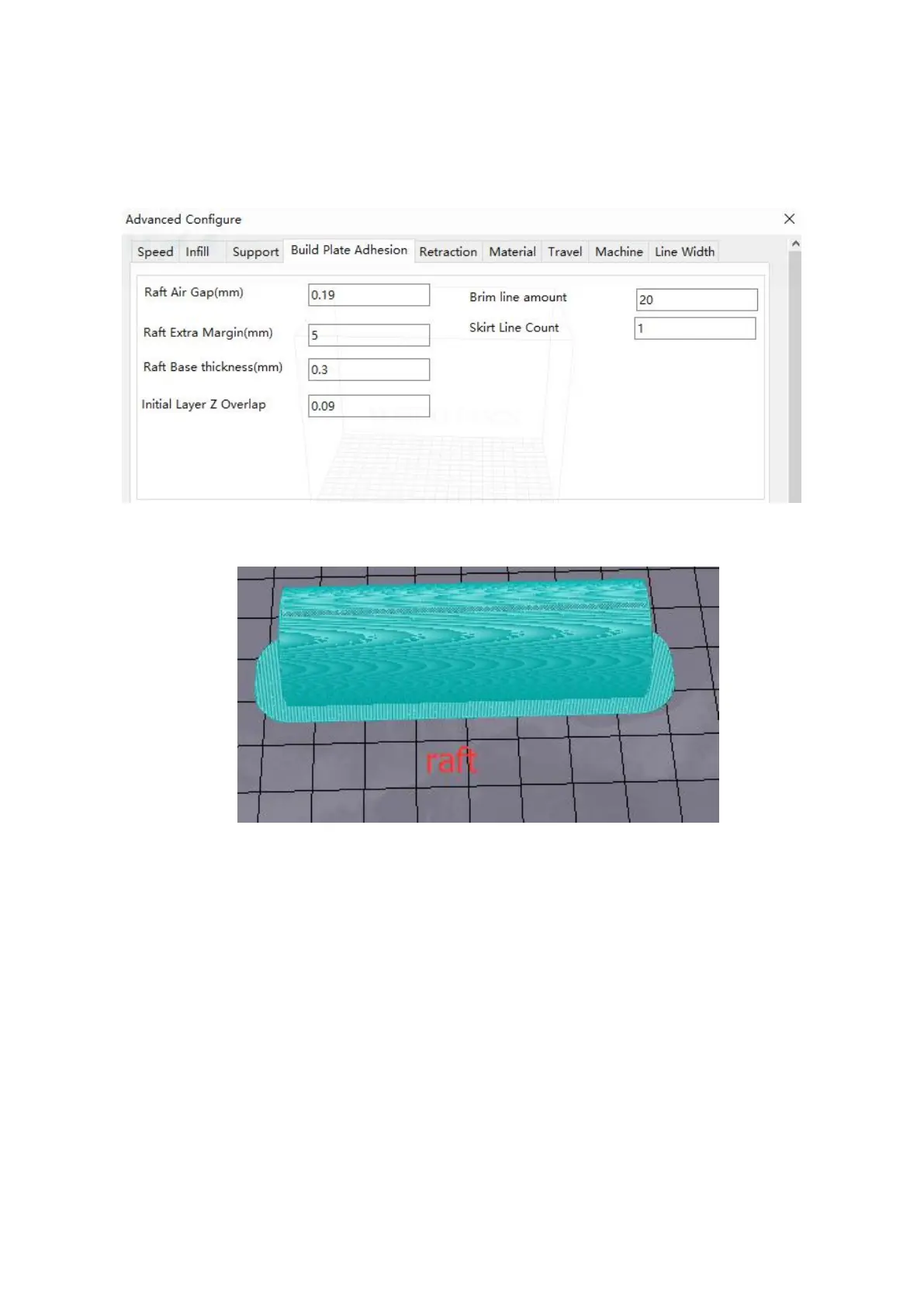 Raft air gap (mm): the space between the the adhesion and the model, the gap of the space
