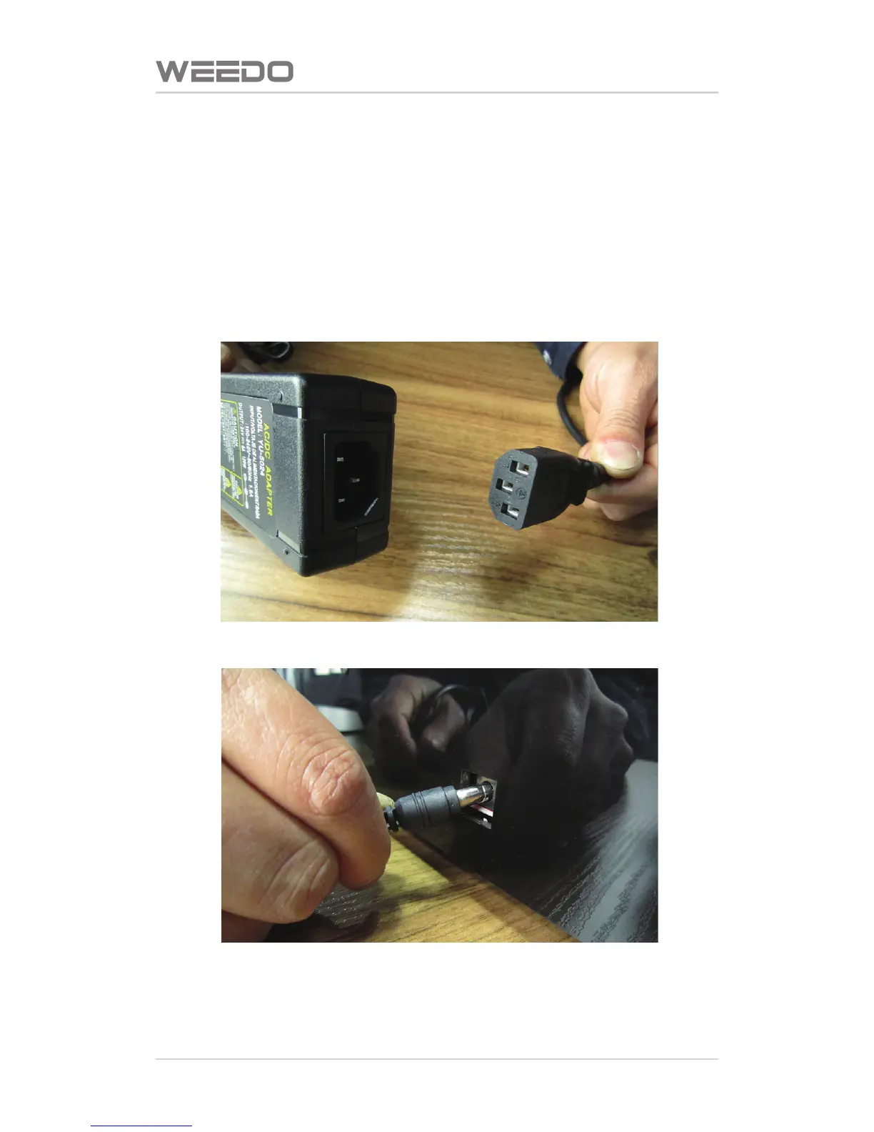 Take out the power cord from the accessories box, plug the male connector to