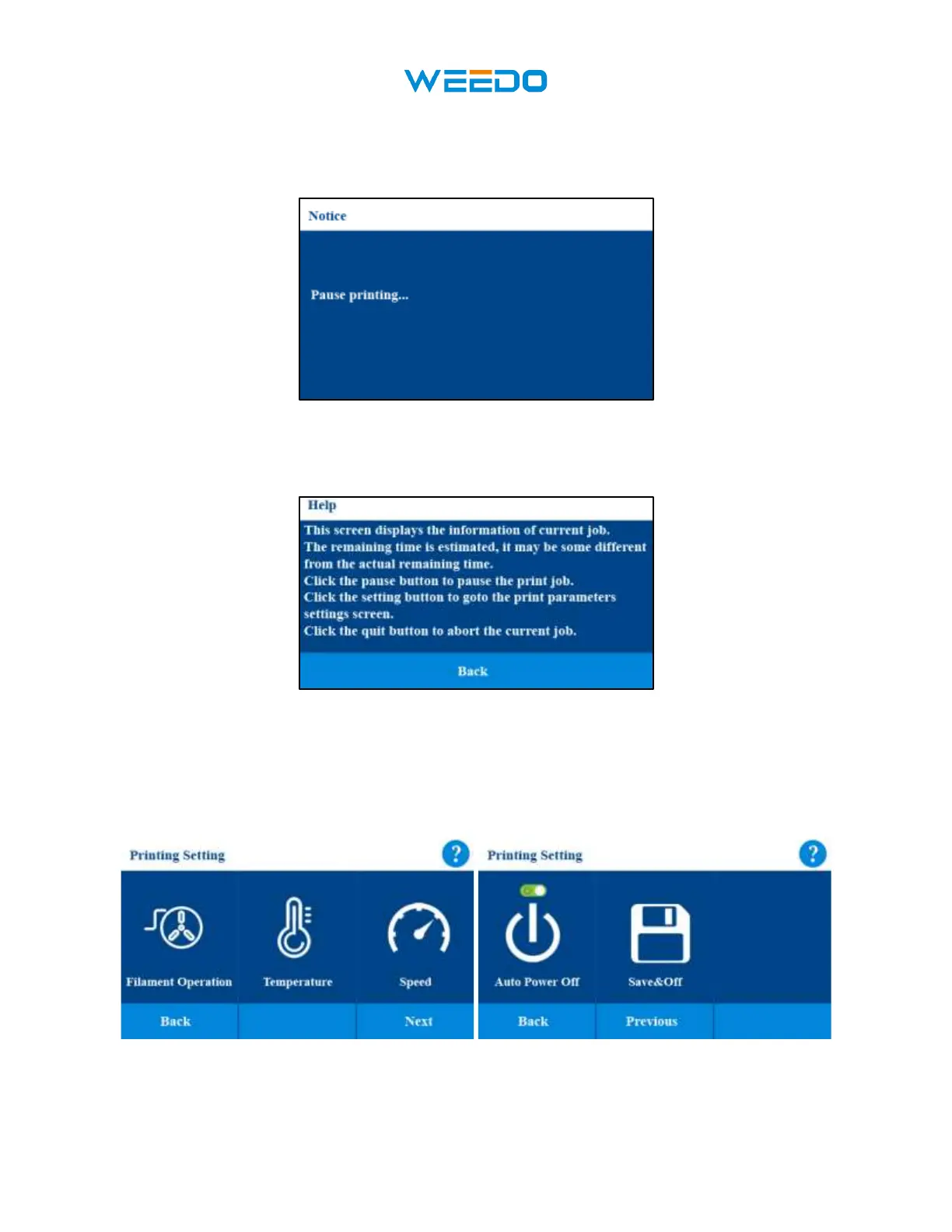 Temperature, Printing Speed, Auto Power Off, Save and Shutdown) can be reset.