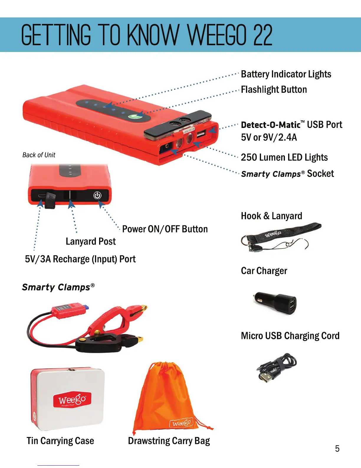 Weego 22 - Getting to Know Your Weego 22; Device Components Identification; Included Accessories Overview
