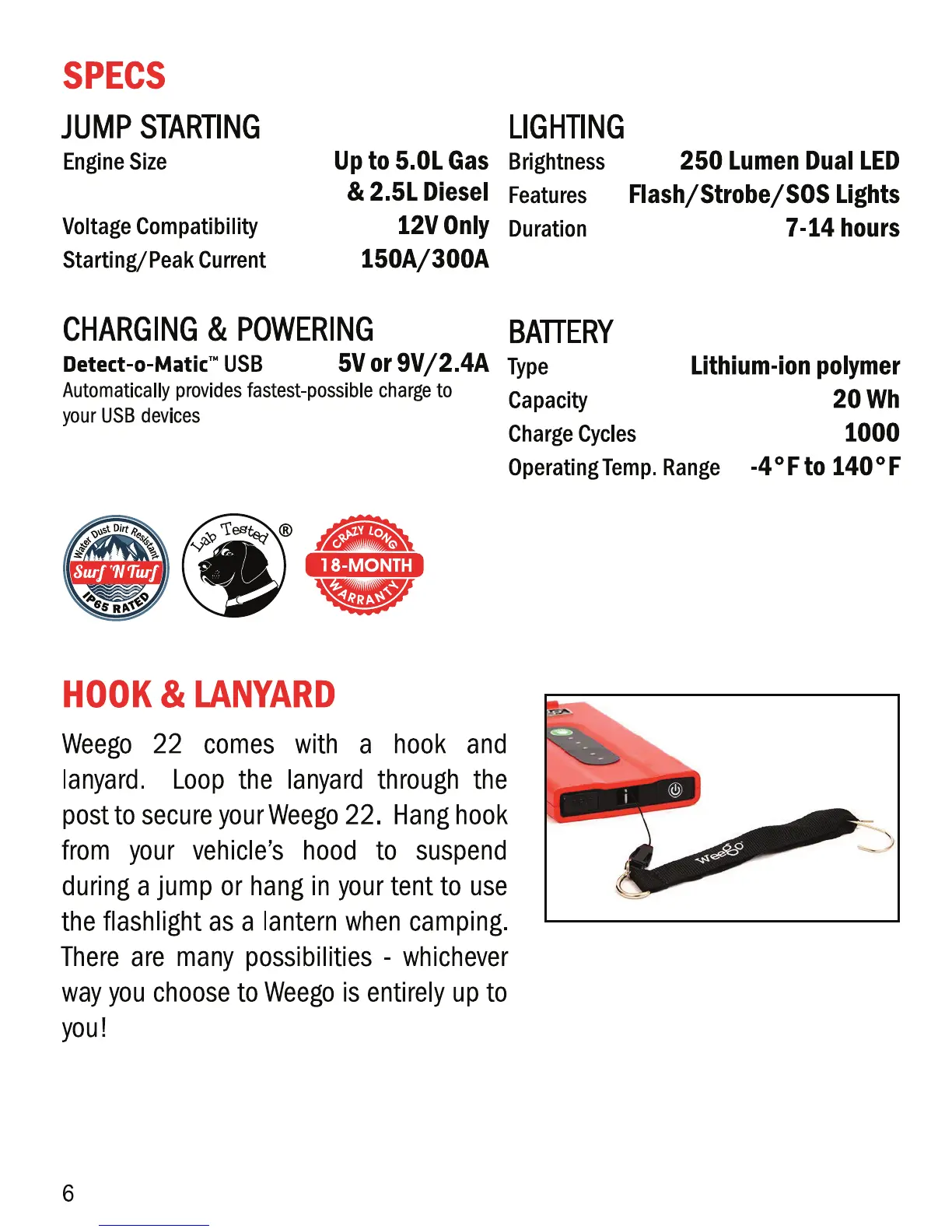 Weego 22 - Weego 22 Specifications; Jump Starting and Lighting Specs; Charging, Battery, and Usage Specs