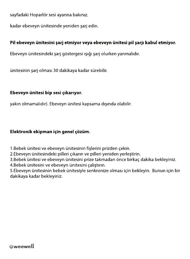 • Piller bitiyor olabilir. Ebeveyn ünitesini, şarj için sağlanan güç adaptörüyle prize