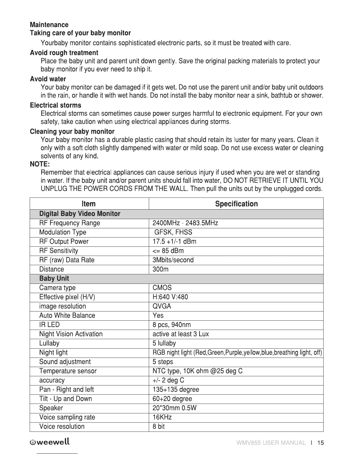 weewell WMV855 - Maintenance; Technical Specifications and Warranty; Technical Specifications