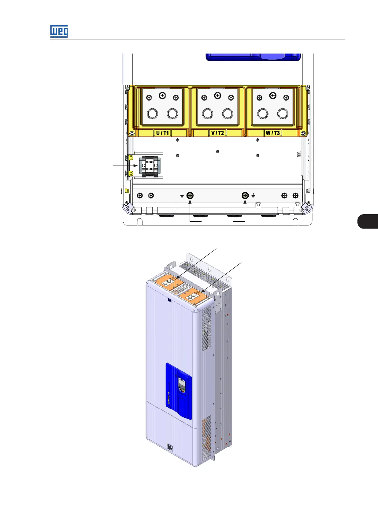 Figure 3.15: (a) and (b) - Grounding, synchronism and power terminals of frame size F models