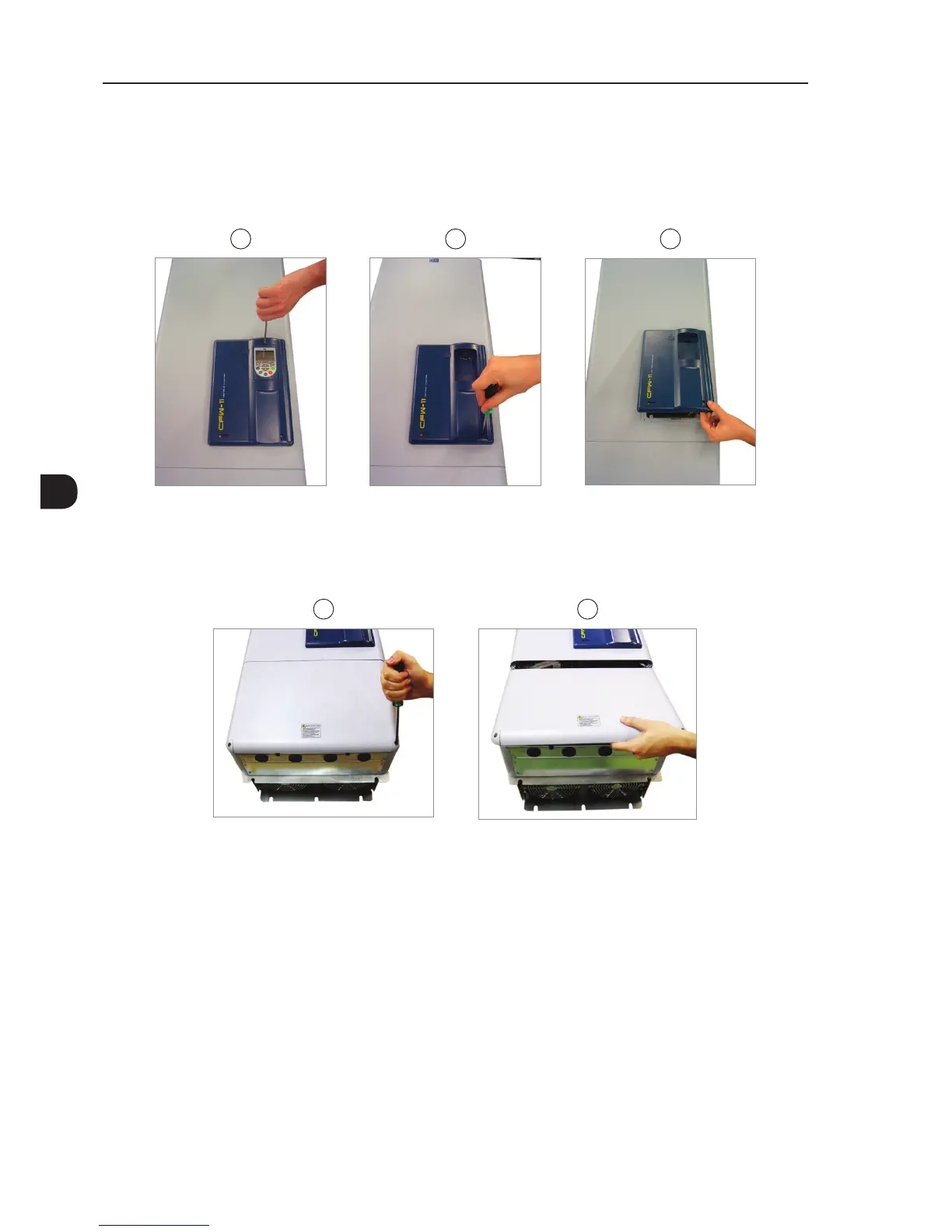 Figure 3.4 - Removal of the bottom front cover, to access to the power supply and motor connection terminals