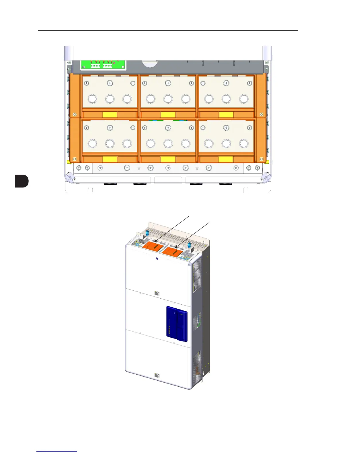 (d) Frame size G with special DC hardware: Terminals for DC voltage supply. Terminals R/L1, S/L2 and T/L3 are not internally
