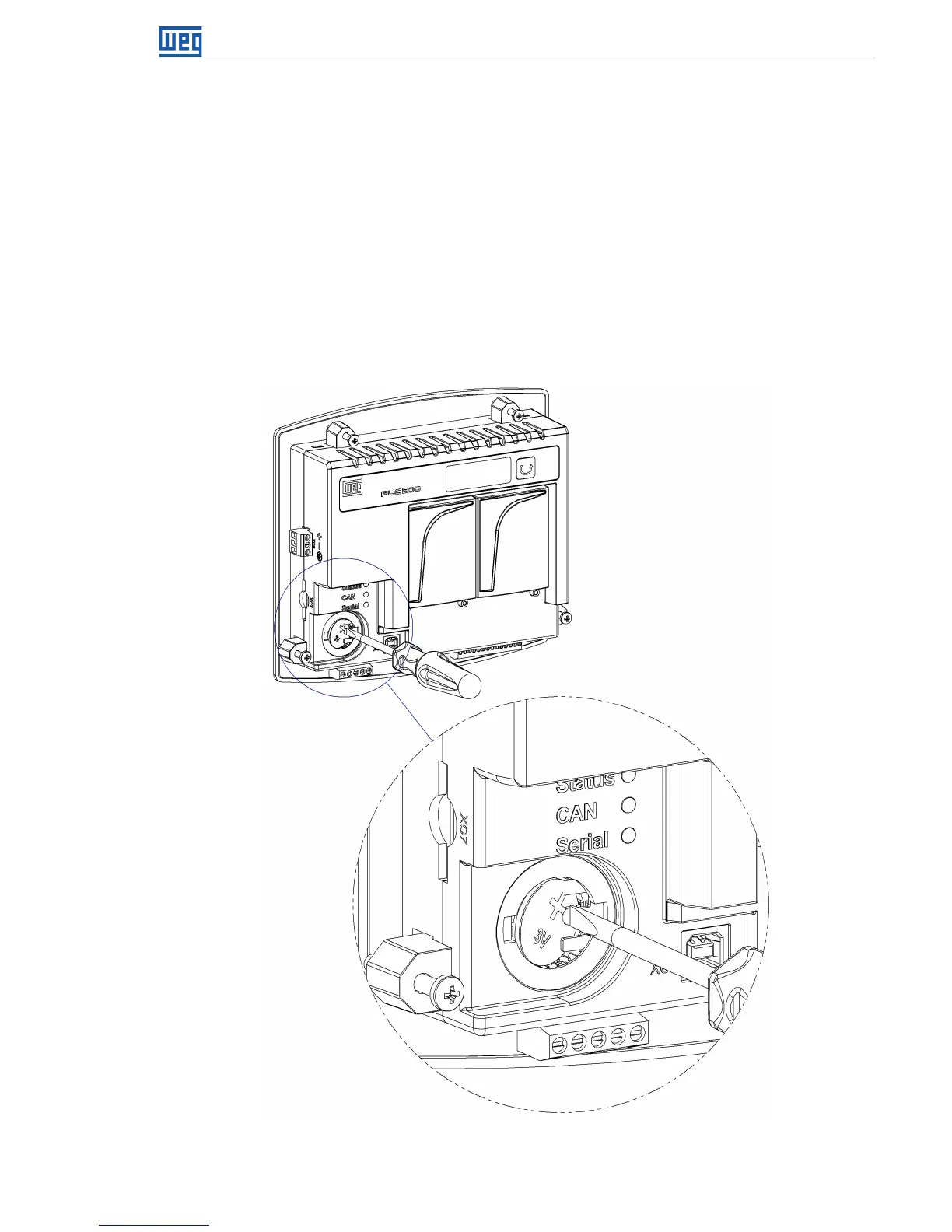 When the PLC300 generates a low battery alarm, or if there isn’t HMI, and the Status LED
