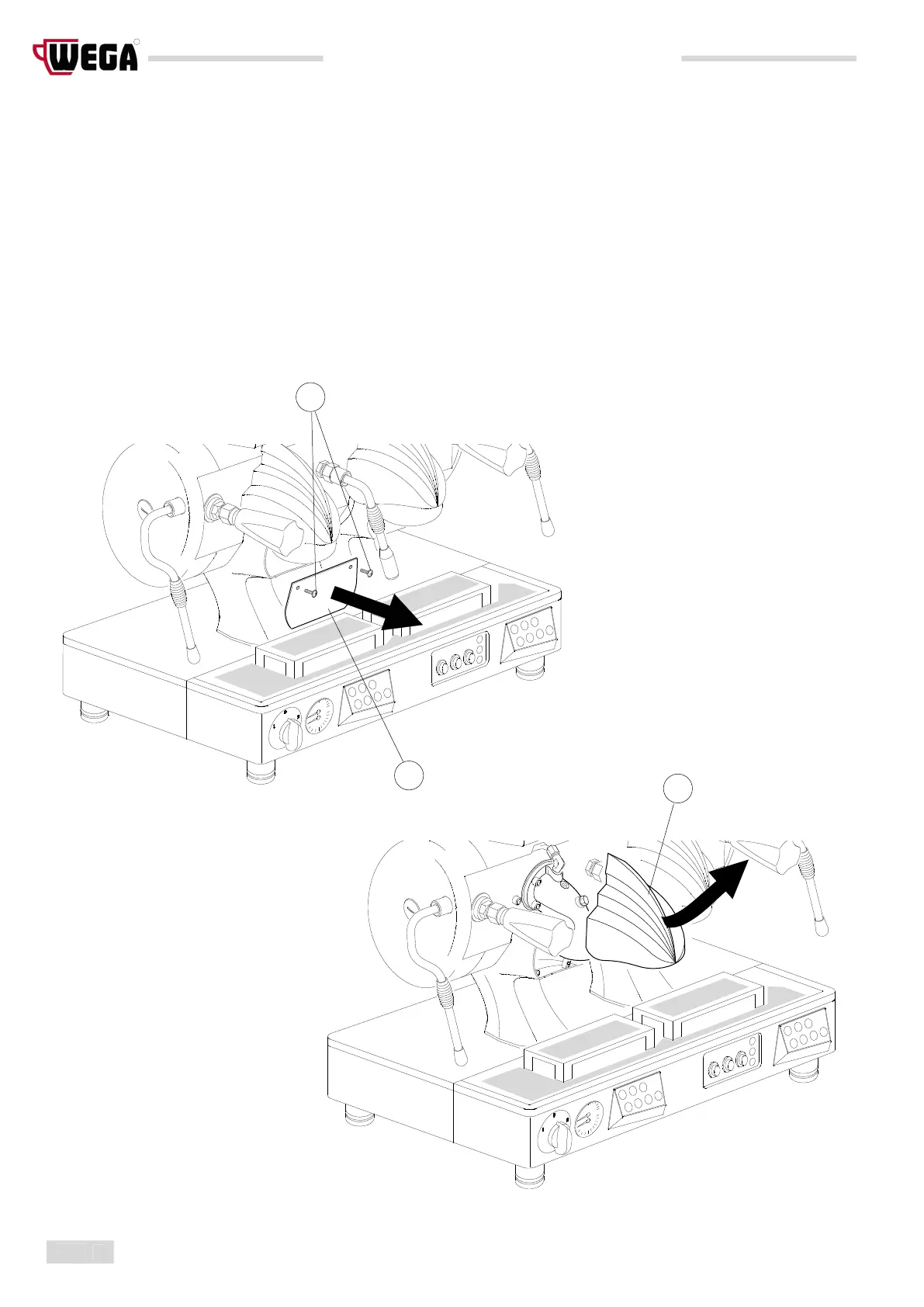 1) Use a 3 mm hex wrench to loosen the fastening screws (A) and remove the stainless steel plaque (B) located under the attachment ring of the delivery group