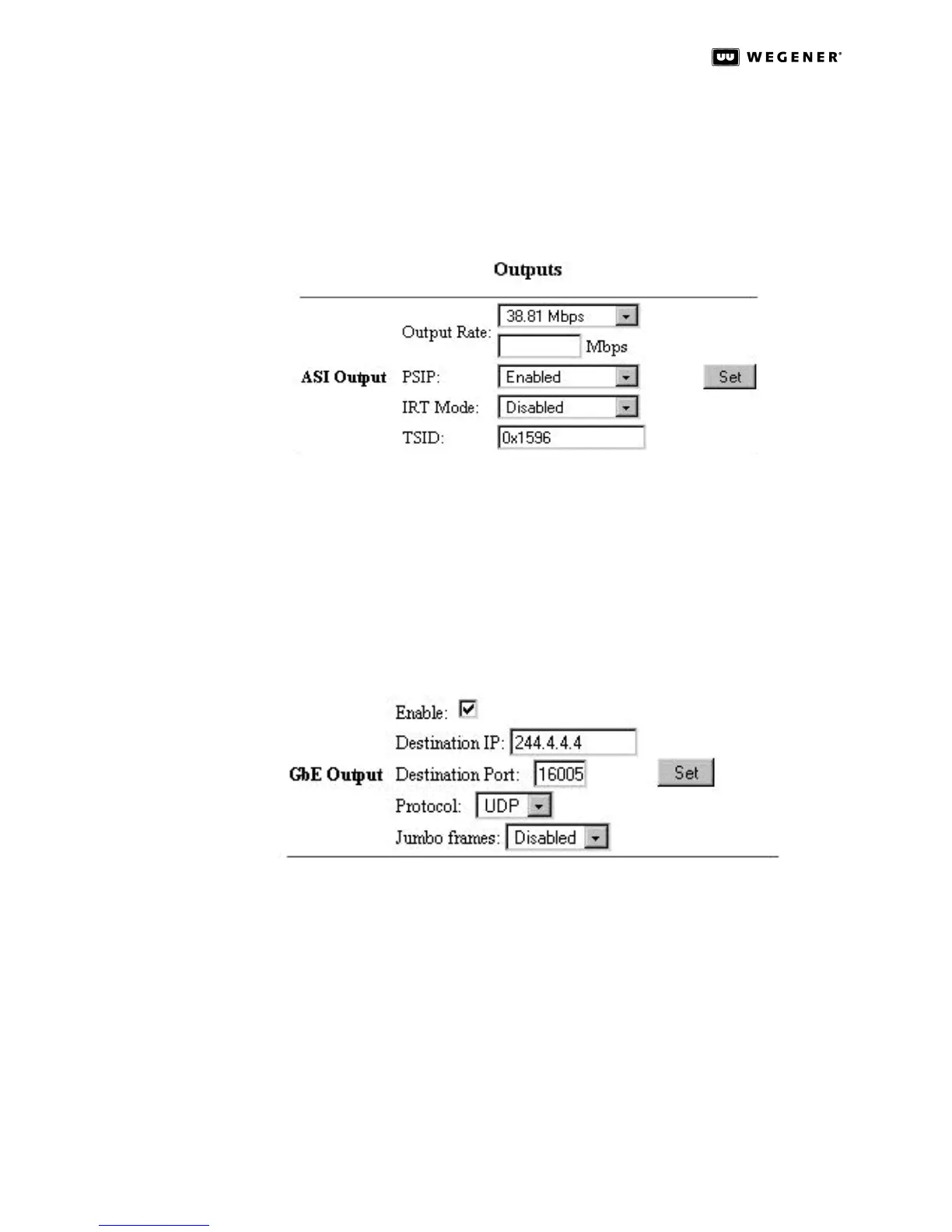 The GbE Output section (if the GbE module is installed) allows the user to Enable GbE