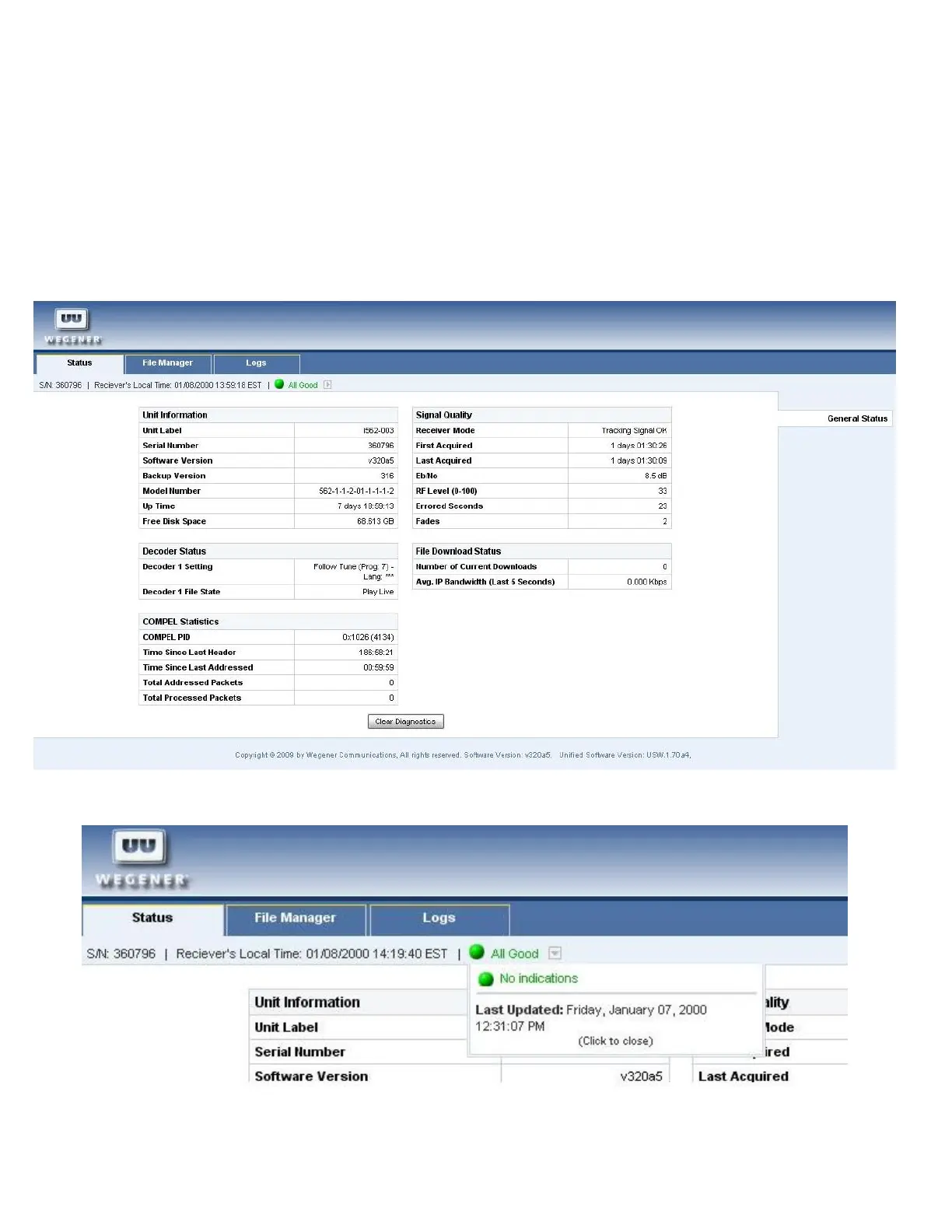 The status view displays the current status of the unit, including the serial number, software versions installed, decoder