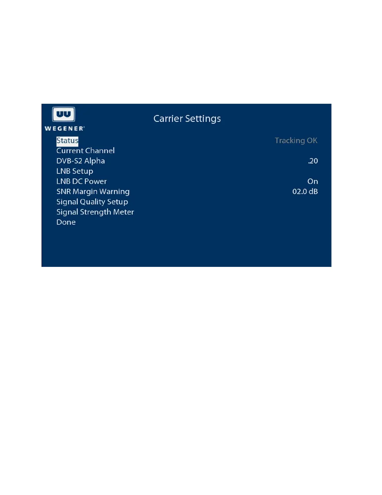 The carrier settings menu allows viewing/changing the tuned RF carrier settings, LNB parameters, signal quality alarm