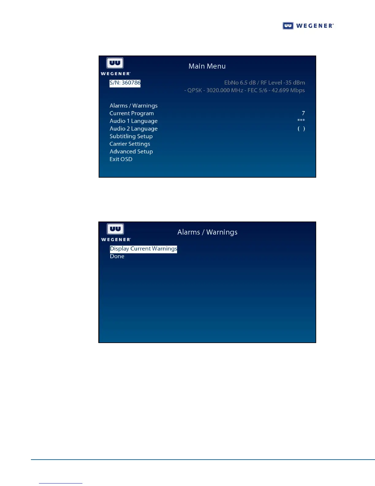 Wegener iPump 562 - Figure 3.32: Ipump 562 OSD Main Menu; Figure 3.33: Ipump 562 OSD Alarms; Warnings