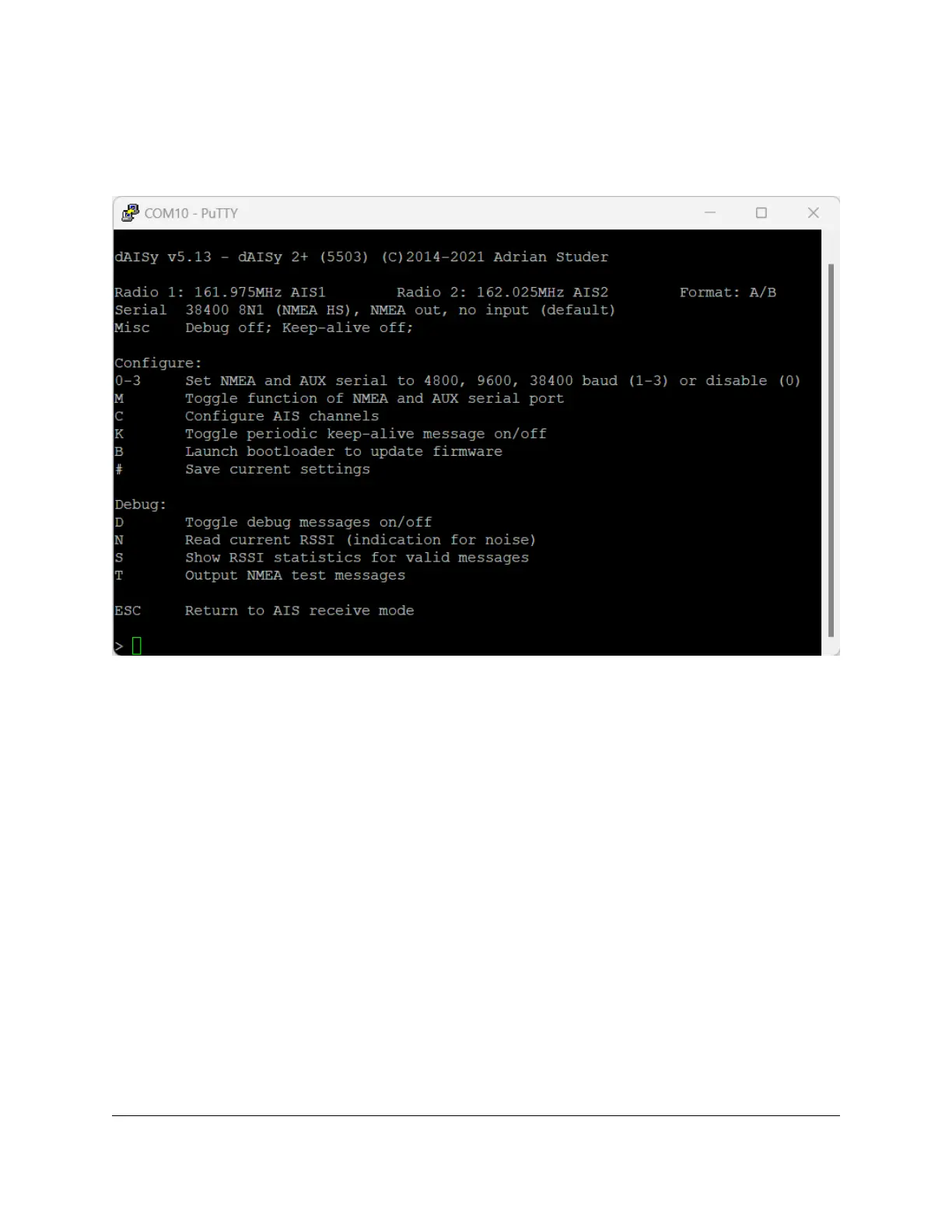 When connecting to dAISy with a serial terminal program (e.g. Putty or Termite on Windows, screen on
