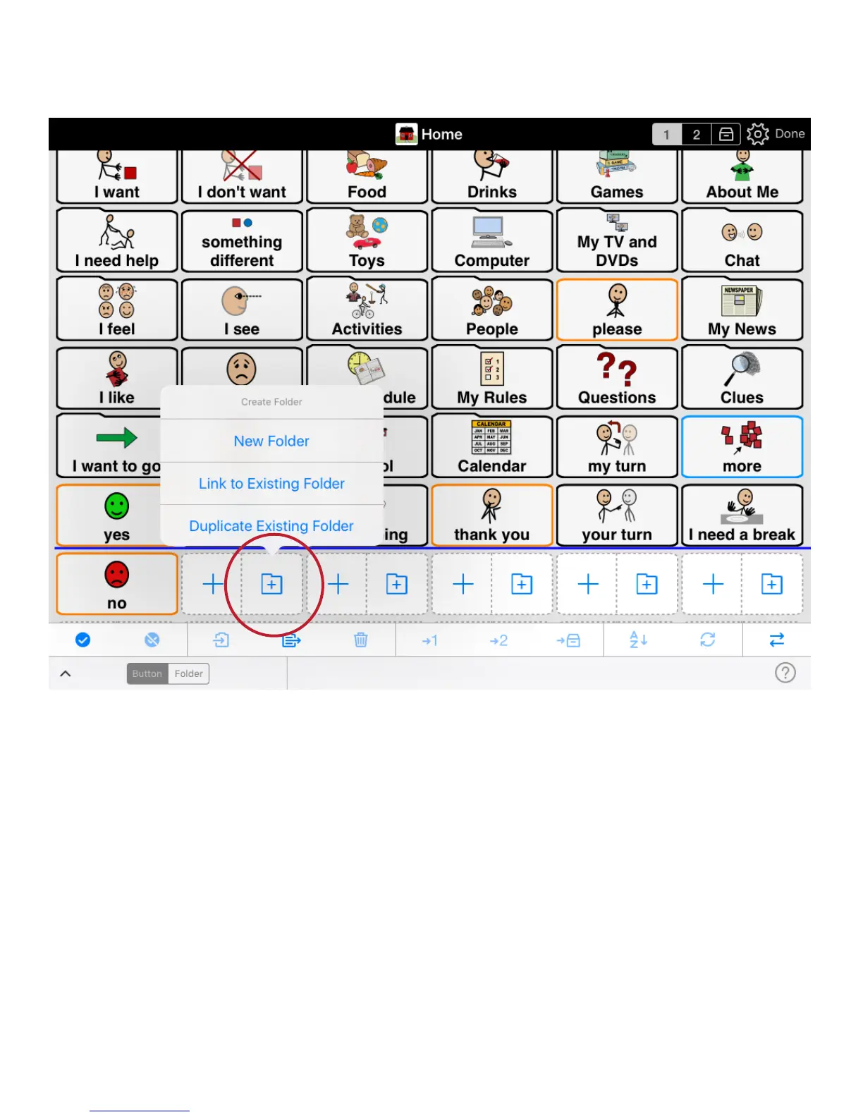 Tap > Add Folder > Tap > Link to Existing Folder, and choose from the list of folders of buttons