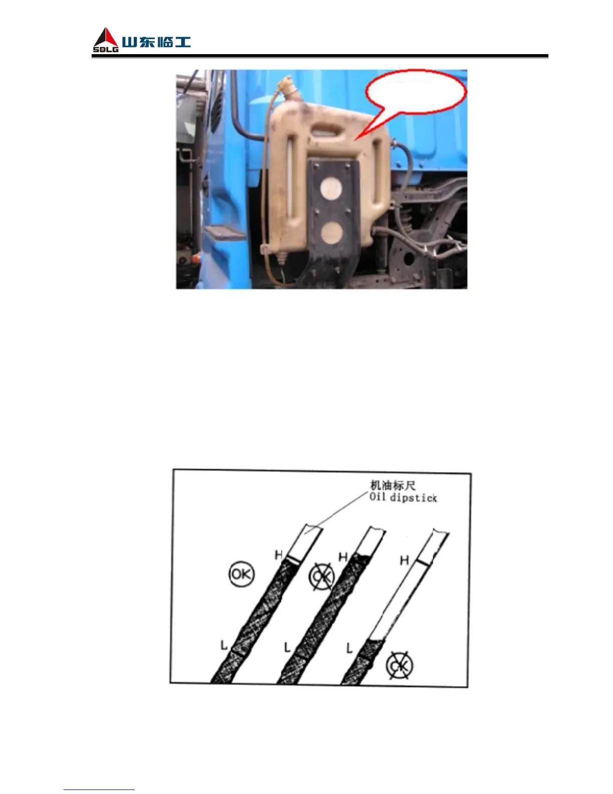 Oil level checking should be done at least 5min later after engine stopped, in order to let engine oil