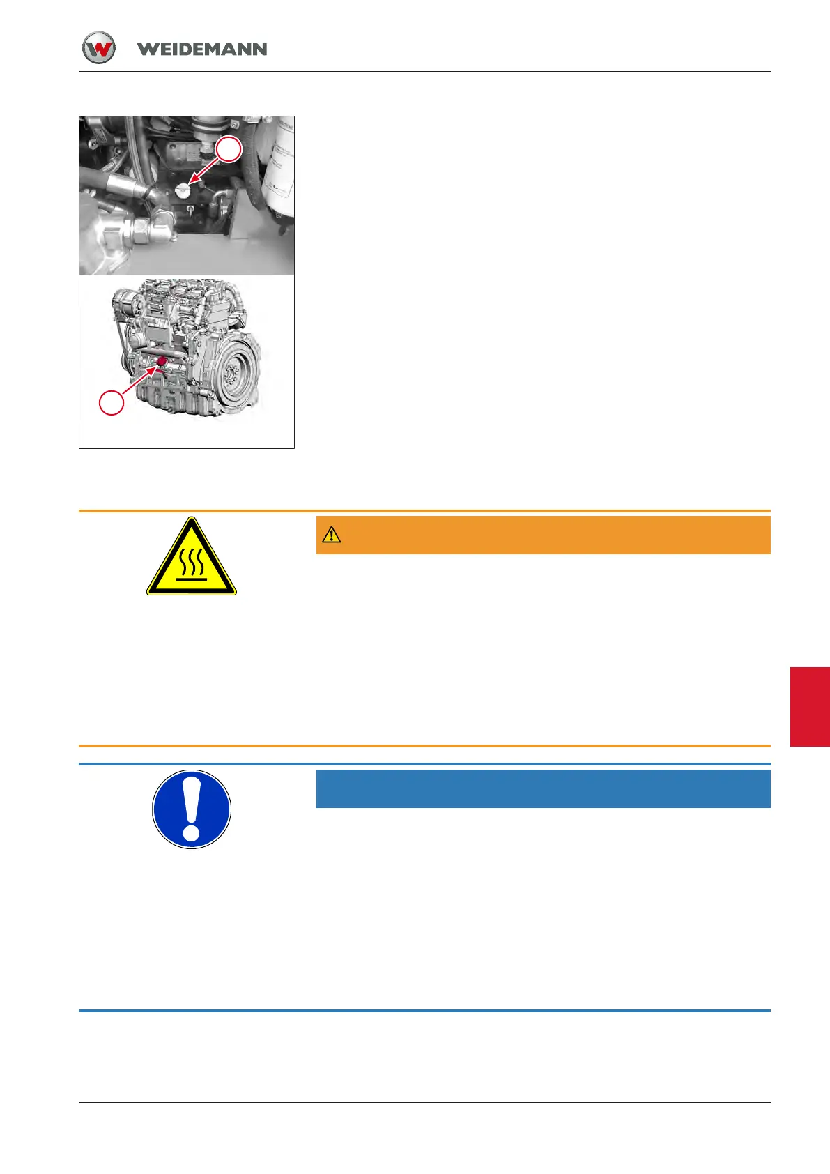 ► Never open the fill opening when the engine is hot or the cooling sys-