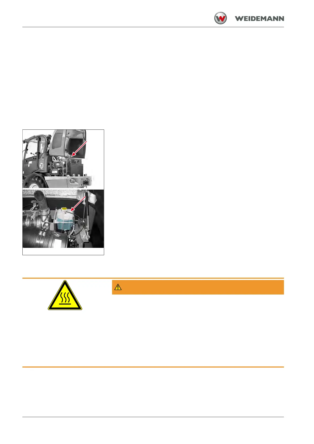 ► Never open the fill opening when the engine is hot or the cooling sys-