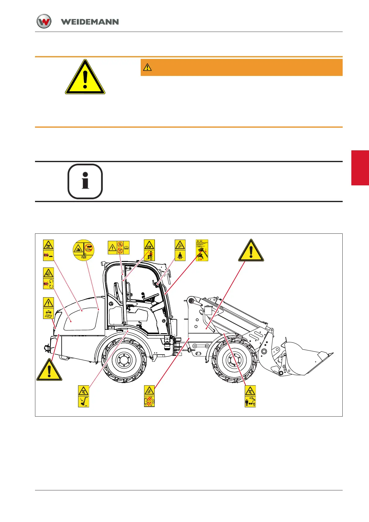 Dotted lines show labels affixed in the cab or under the engine cover.