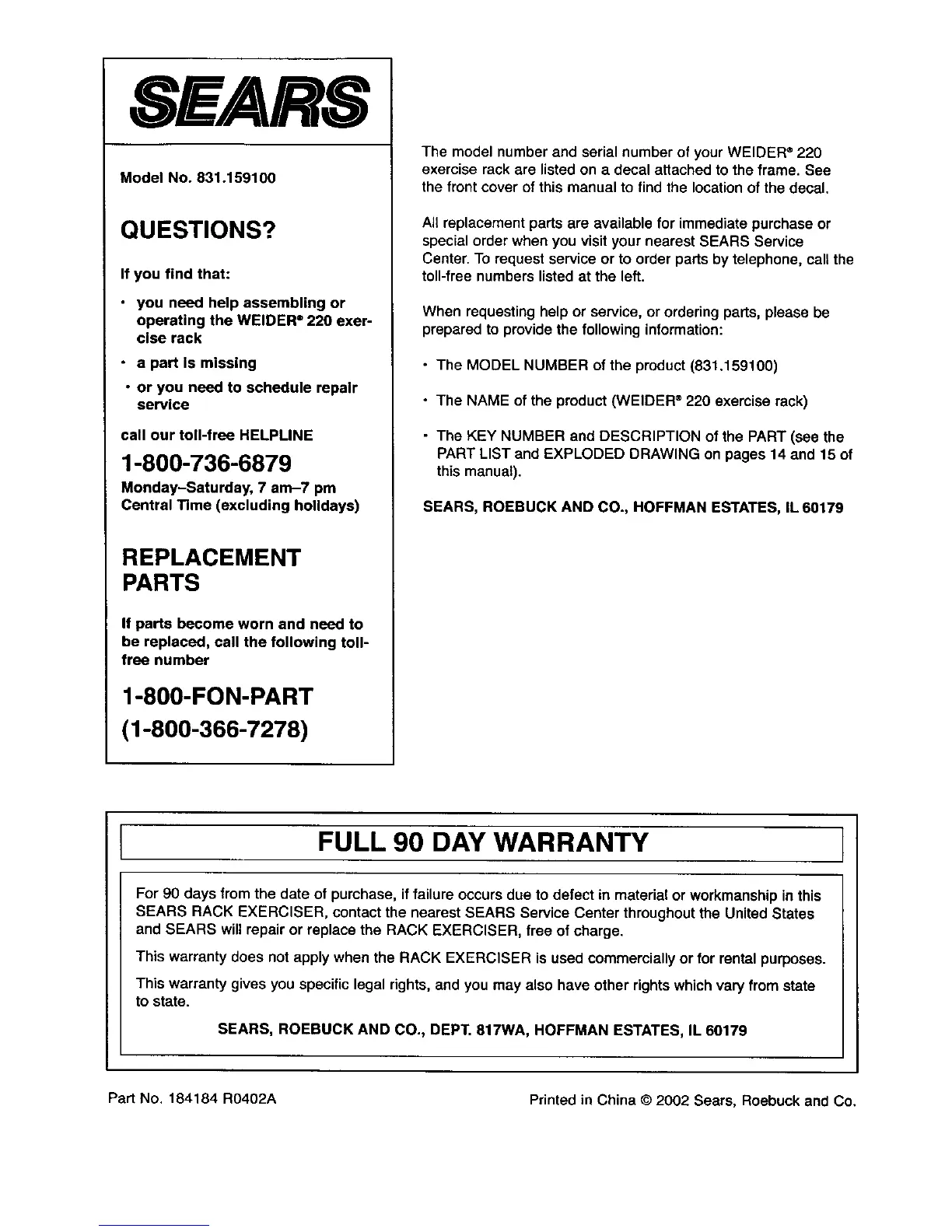Part No. 184184 R0402A Printed in China © 2002 Sears, Roebuck and Co.