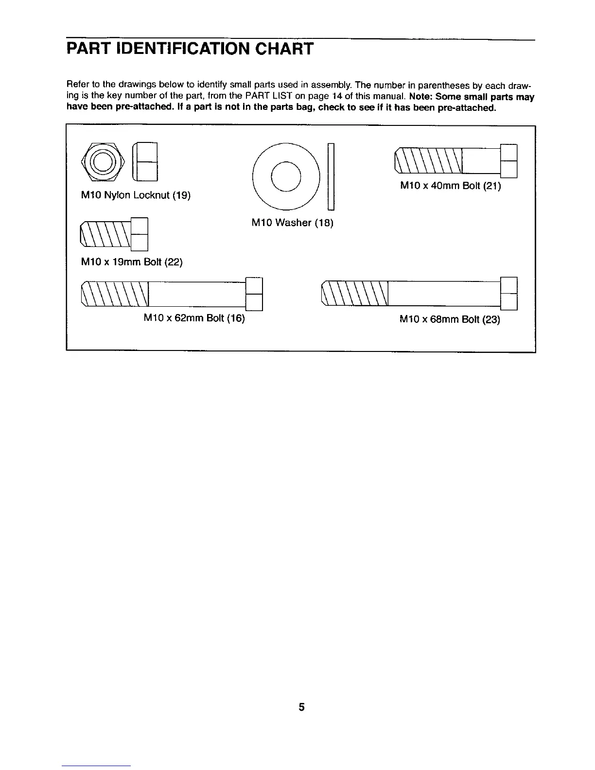 Refer to the drawings below to identifysmall parts used in assembly. The number in parentheses by each draw-