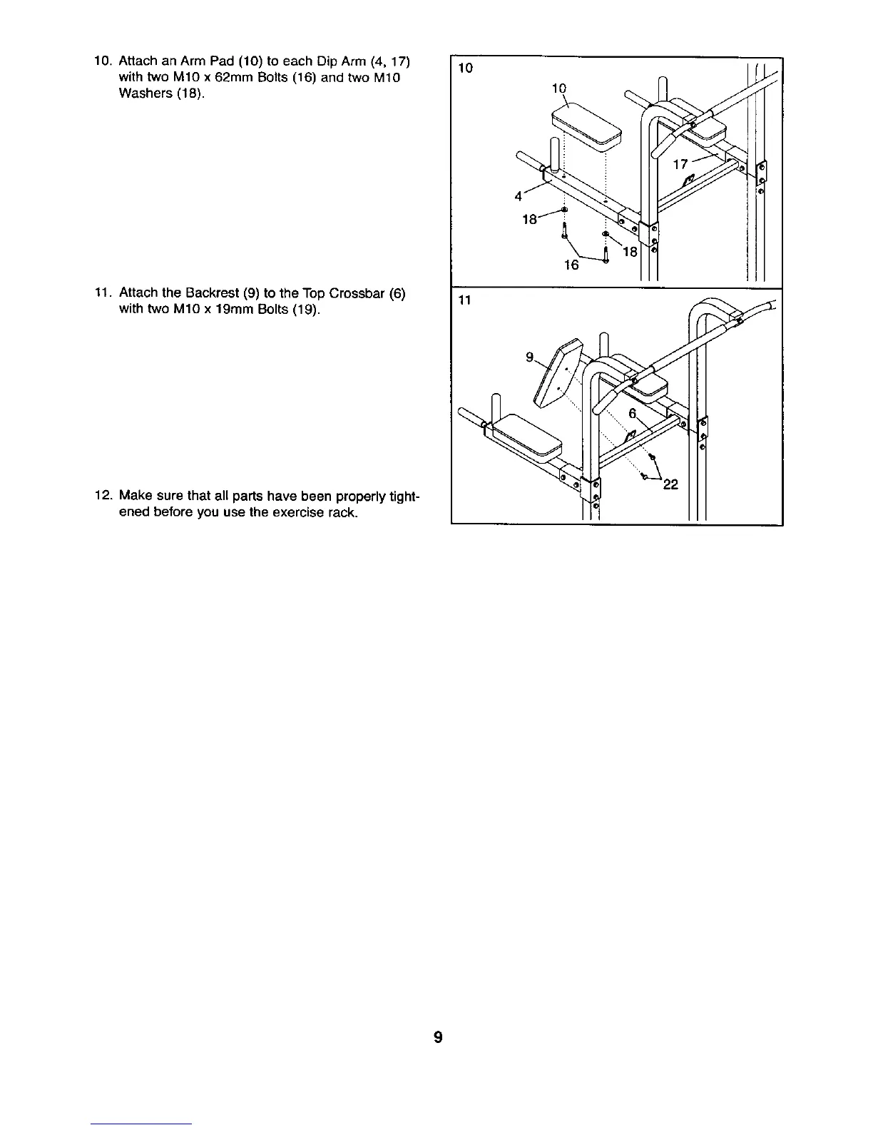 10. Attach an Arm Pad (10) to each Dip Arm (4, 17)