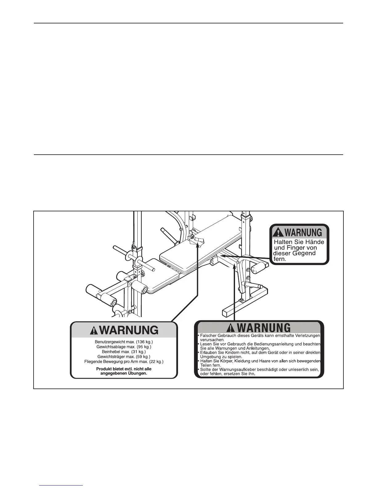 Die unten abgebildeten Warnungsaufkleber wurden an den angezeigten Stellen der Hantelbank ange-