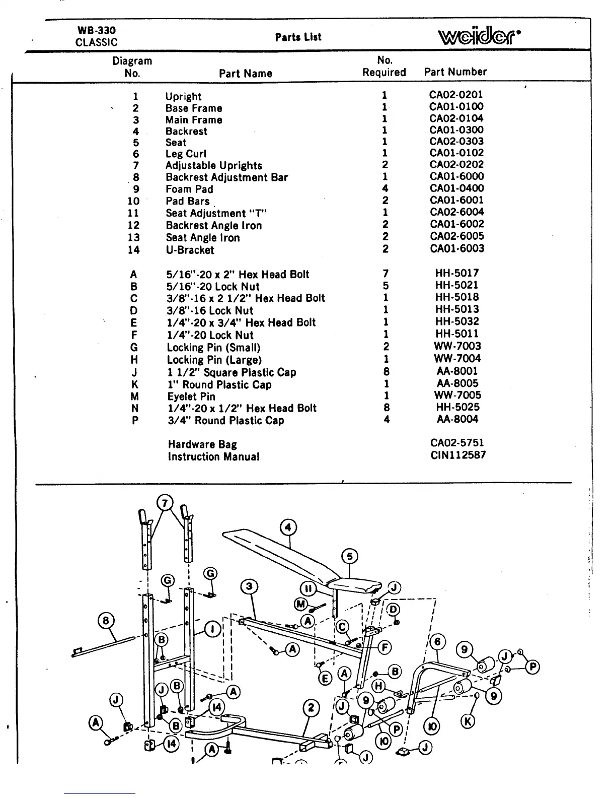 Weider 330 Classic Bench - Parts List; Diagram