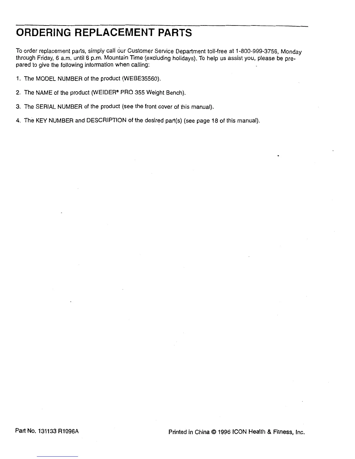 Weider 355 - Ordering Replacement Parts; Spare Parts Ordering Procedure