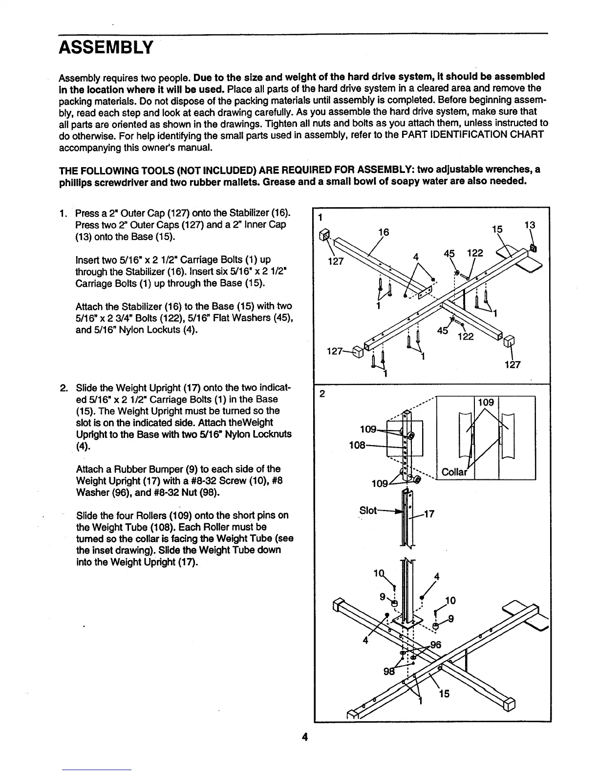 Weider 8300 Hard Drive - ASSEMBLY; Base and Stabilizer Assembly; Weight Upright and Roller Installation