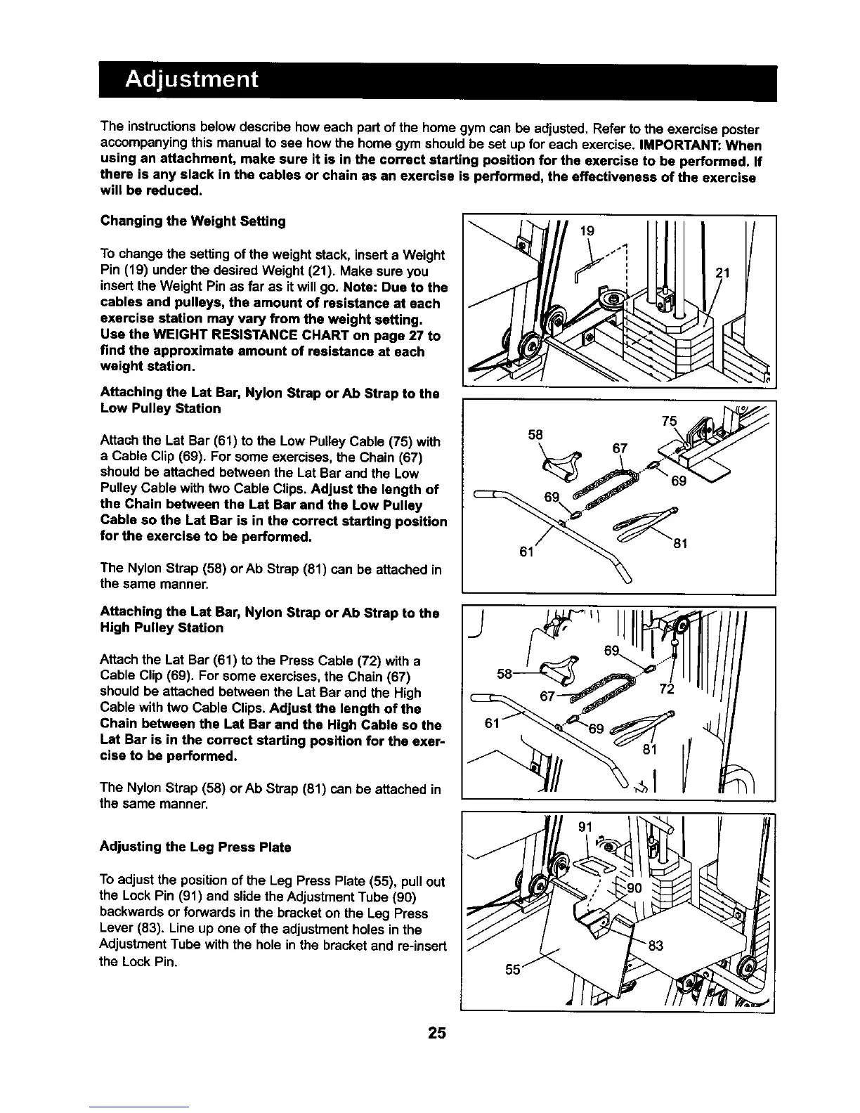 The instructionsbelowdescdbe how each part ofthe home gym can be adjusted.Refer to the exercise poster