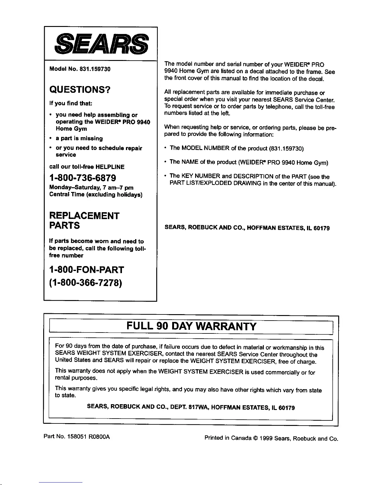 SEARS WEIGHT SYSTEM EXERCISER, contactthe nearest SEARS Service Center throughoutthe