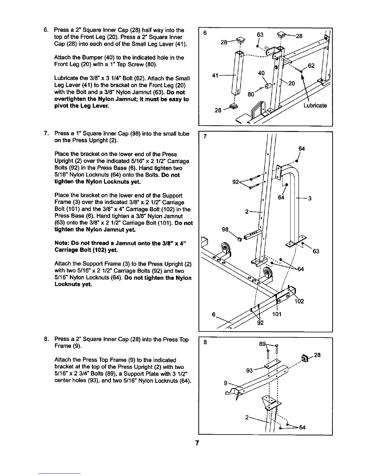 5/16" Nylon Locknuts(64). Do not tighten the Nylon